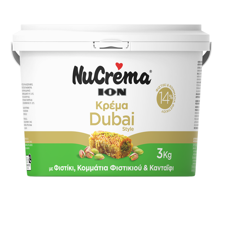 Η δημοφικής γεύση Dubai και σε κρέμα! Η NuCrema Dubai συνδιάζει το τραγανό φύλλο κανταΐφι με λαχταριστή κρέμα 14% κελυφωτού φιστικιού και κομμάτια φιστικιού. Ιδανική ως έχει για γεμίσεις σε γλυκίσματα, σοκολατάκια, αρτοσκευάσματα, κρέπες και κρουασάν