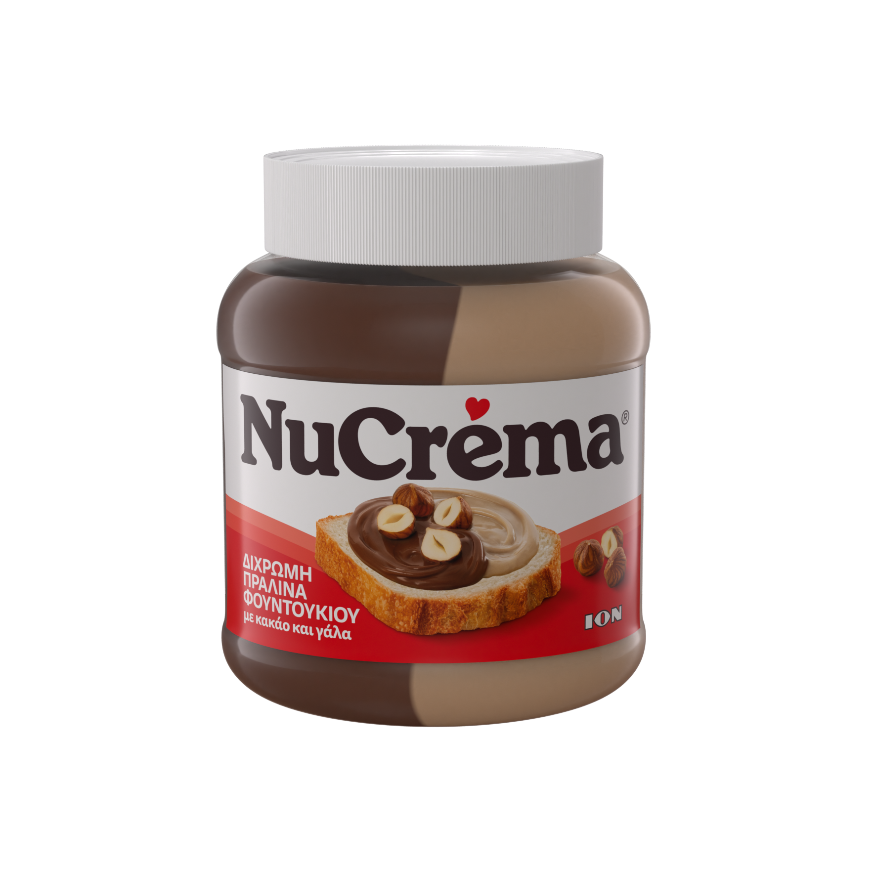 Δύο γεύσεις, στο ίδιο βάζο! Η μια κρέμα δίπλα στην άλλη! Η κλασσική NuCrema πραλίνα φουντουκιού με κακάο και στο ίδιο βάζο με την λευκή πραλίνα φουντουκιού ΝuCrema ! Σε κάθε κουταλιά απολαμβάνεις και άλλη γεύση πραλίνας φουντουκιού: είτε κακάο, είτε λευκή!